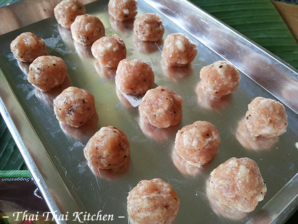 ๒.นำส่วนผสมมีทบอลออกจากตู้เย็นแล้วปั้นเป็นก้อนกลมๆ เราปั้นเสร็จแล้วกลัวมันไม่เซ็ทตัวดีเลยเอาไปแช่ตู้เย็นไว้อีกรอบนึงค่ะ