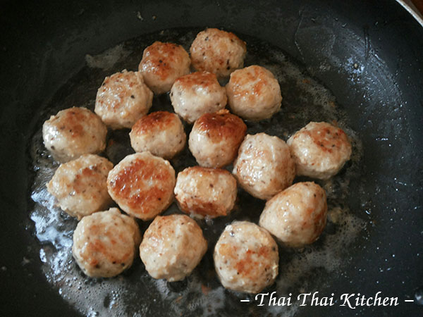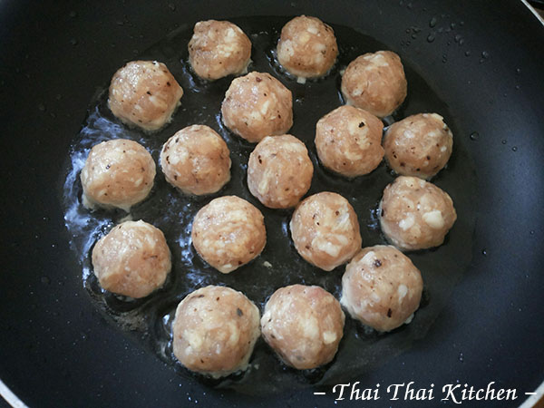 ๓.ตั้งกะทะใส่น้ำมันรอจนน้ำมันร้อนแล้วนำมีทบอลออกมาทอด ขั้นนี้ระวังอย่าให้ไฟแรงเกินไปไม่งั้นมันจะไหม้ได้นะคะ