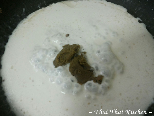๕.นำเครื่องแกงลงไปผัดให้เข้ากันกับกะทิ ลองชิมเครื่องแกงดูก่อนก็ดีนะคะจะได้รู้ว่าควรจะใส่ปริมาณเท่าไหร่ไม่ให้เผ็ดจนเกินไปหรือใครจะค่อยๆใส่ก็ได้ค่ะ ขั้นนี้เราปรุงรสเพิ่มอีกนิดด้วยน้ำตาลปี๊บเพราะรู้สึกว่ามันยังออกแค่เผ็ด เค็มแล้วก็มันๆกะทิ