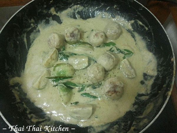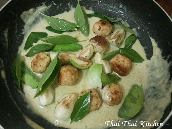 ๖.นำมีทบอล มะเขือเปราะ ใบมะกรูดฉีกและใบโหระพาลงไปผัด ใครจะไม่ใส่พอร์คบอลตอนนี้แต่ไปวางในจานแล้วราดทีเดียวก็ได้ค่ะแต่เราใส่ลงไปเลยเพราะอยากให้น้ำซอสเขียวหวานได้ซึมเข้าไปในเนื้อ