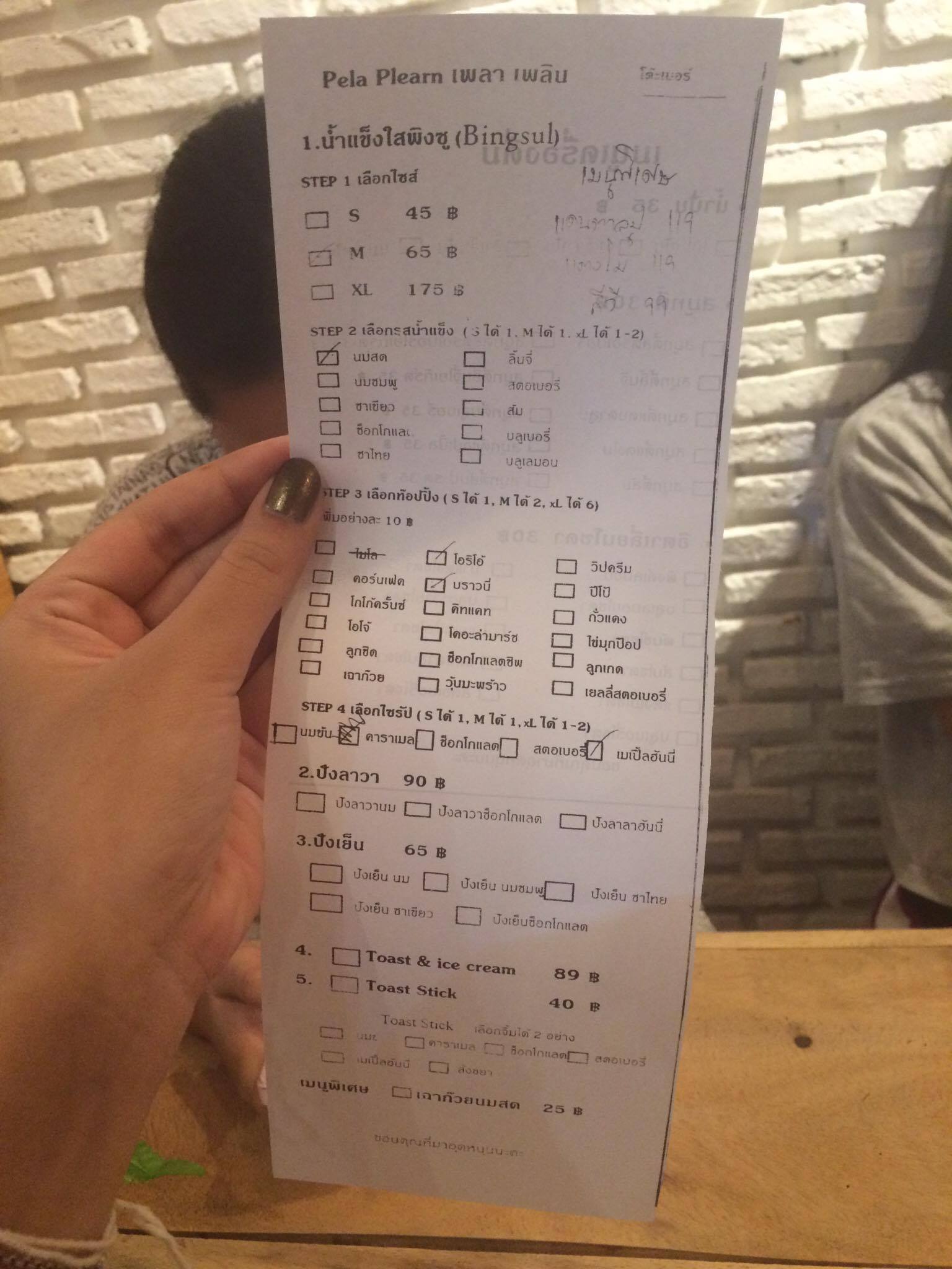วันนี้ขอเสนอเมนูที่มีชื่อว่า .. น้ำแข็งใสพิงซู ที่จขกท.สั่งเป็น Size M น้ำแข็งใสเป็น Chocolate ใส่ Topping เป็น เยลลี่ บราวนี่ และก็ช็อคโกแลตชิพ