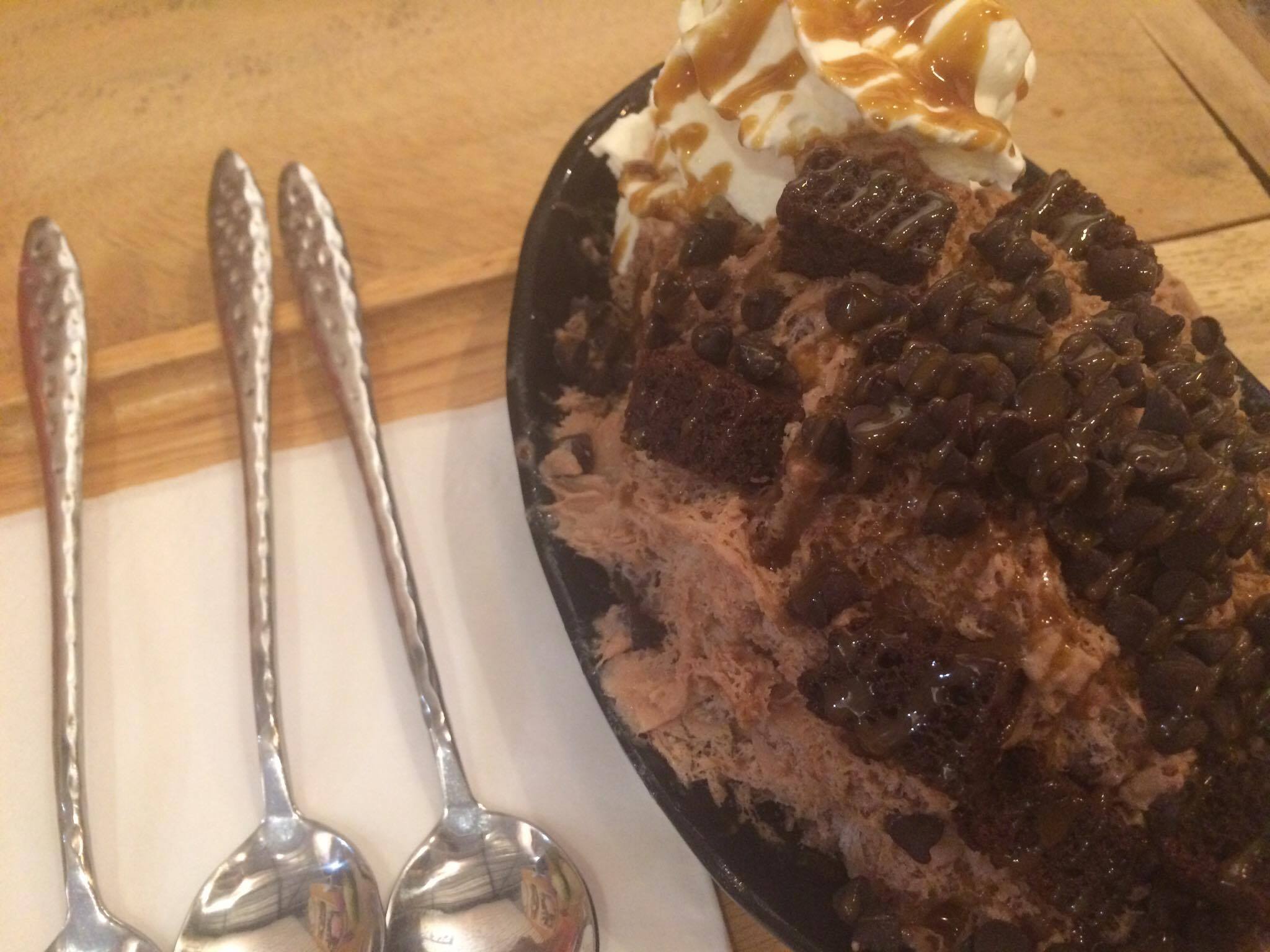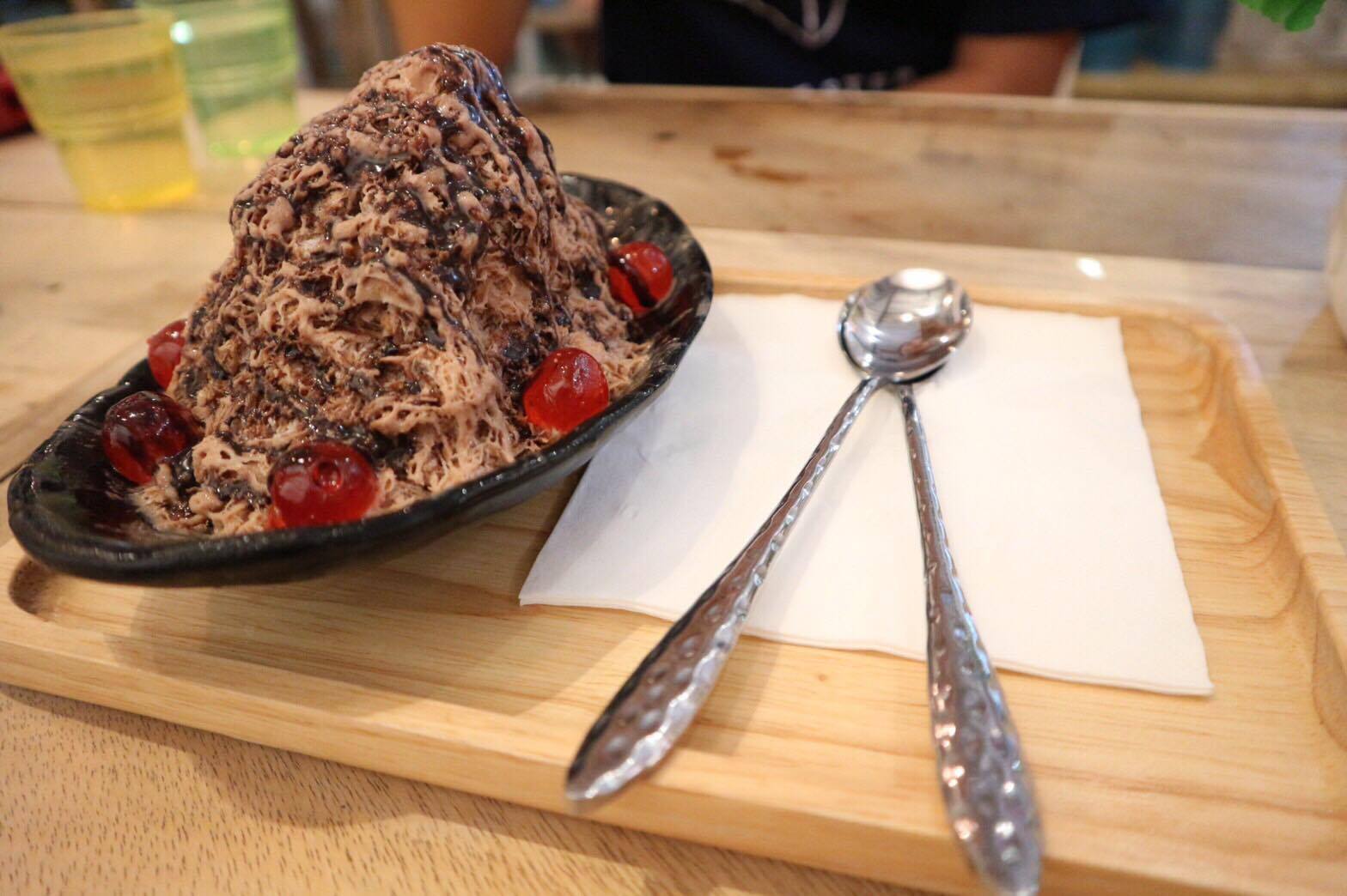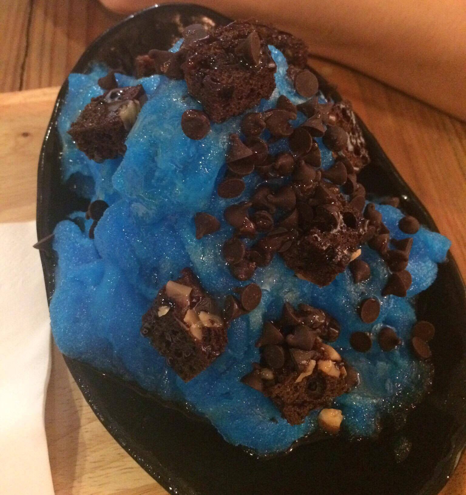 เมนูนี้ก็น้ำแข็งใสพิงซูเหมือนเดิม เพิ่มเติมคือรสชาติเปลี่ยนเป็นบลูเลมอน Topping เป็นบราวนี่กับช็อคโกแลตชิพ ราดด้วยช็อคโกแลตจ้า