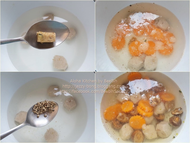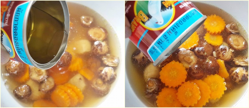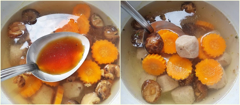 ใส่แครอทหั่น ใส่ลูกชิ้นเห็ดหอม แบ่งก้านคึ่นไช่บางส่วนลงไปต้มเพื่อให้น้ำแกงหอม