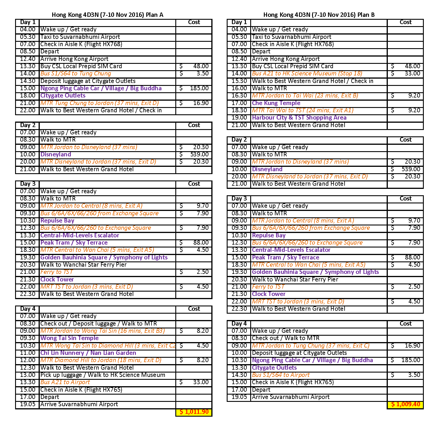 พอดีเรากับแฟนจะไปฮ่องกง 4 วัน 3 คืน เลยแพลนกันว่าซื้อเฉพาะตั๋วเครื่องบินกับที่พัก และไปกันเองไม่ได้ไปกับทัวร์ แฟนเคยไปครั้งนึงเมื่อ 5 ปีก่อน แต่มันนานมากแล้วเค้าจำอะไรไม่ค่อยได้ แต่ก็อุตส่าห์วางแผนทริปให้เราทุกอย่าง ออกมาเป็นแพลน A กับแพลน B ตามรูป