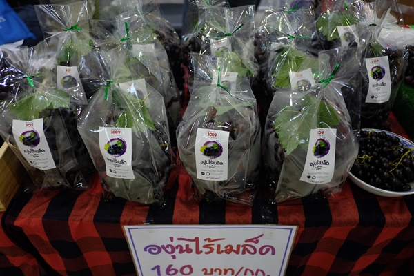 ส่งตรงจากวังน้ำเขียว โคราช งานนี้ "พี่จอย" เจ้าของสวนมาขายเองกับมือ เป็นองุ่นไร้เมล็ดและน้ำองุ่นเพียวๆ 100% ไม่ผสมน้ำตาล สำหรับคนรักสุขภาพ มีวิตามินซีสูง ช่วยบำรุงเลือดให้ไหลเวียน และไปหล่อเลี้ยงหัวใจได้ดี เห็นสรรพคุณดีอย่างนี้ไม่ทานได้ยังไง ขวดละ 40 แพ็ค 4 ขวด 140 บาท ก็ลดไปตั้ง 20 บาทแหน่ะ น้ำองุ่นสามารถเข้าตู้เย็นเก็บได้นานถึง 6 เดือน ส่วนองุ่นโลละ 160 สดๆ ตัดแล้วมาขายกันทันที รสชาติหวานอมเปรี้ยว เม็ดเล็กกำลังดี ทานเพลินจนเผลอแปปเดียวหมดไปสองพวงแล้วจ้า ส่วนน้ำองุ่นคือที่สุดของความเข้มข้น รสชาติเปรี้ยวหวาน ทานแล้วฟินแน่นอน ทั้งอร่อยและได้สุขภาพแบบทูอินวันไปเลย