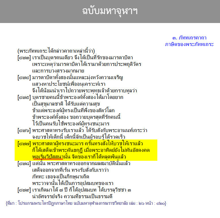....ส่วนข้อความว่า "พอเริ่มวิปัสสนา" ก็ไม่มีในตัวพระไตรปิฎก