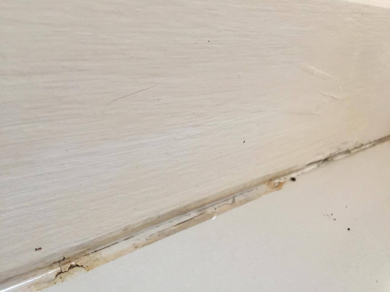เราจะสังเกตได้ยังไงคะว่าน้ำรั่วมาจากไหน ผนังที่ว่าเป็นผนังห้องครัวที่ติดกับห้องน้ำค่ะ บริเวณรั่วซึมน่าจะอยู่ติดกับท่อของสายชำระและชักโครก จขกท ลองไม่ใช้ห้องน้ำดูแต่ว่าระหว่างวันก็ยังมีรั่วซึมออกมาขังที่ขาโต๊ะอยู่ดี ทีนี้โต๊ะเรามันเป็นบิลท์อิน เราจะยกเพื่อหนีน้ำขังก็ไม่ได้ ตอนนี้ขาโต๊ะเปื่อยหมดแล้ว ฮืออ