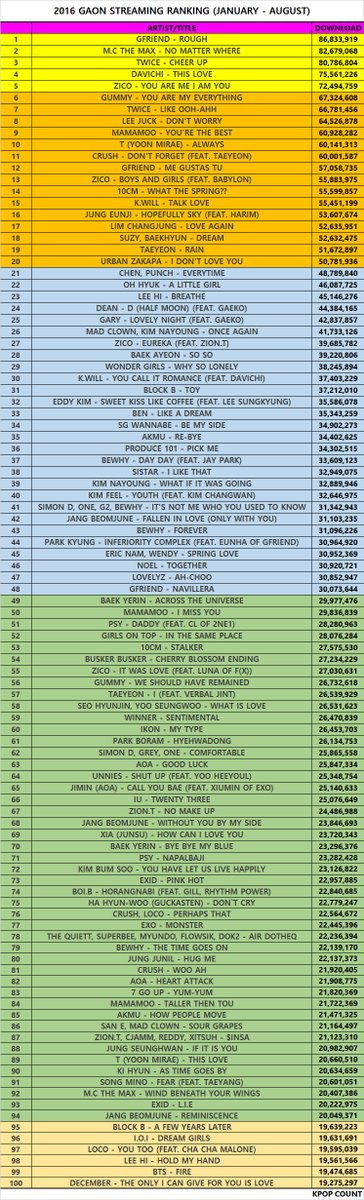 [K-POP] อันดับการสตรีมเพลงจาก GAON (ม.ค.-ส.ค.) 2016