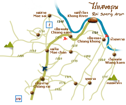 ระยะทางจากอ.แม่สายมาถึงไร่แสงอรุณ ประมาณ 80 กิโลเมตร ขับประมาณชั่วโมงครึ่ง หรืออาจขับยาวจากเชียงราย