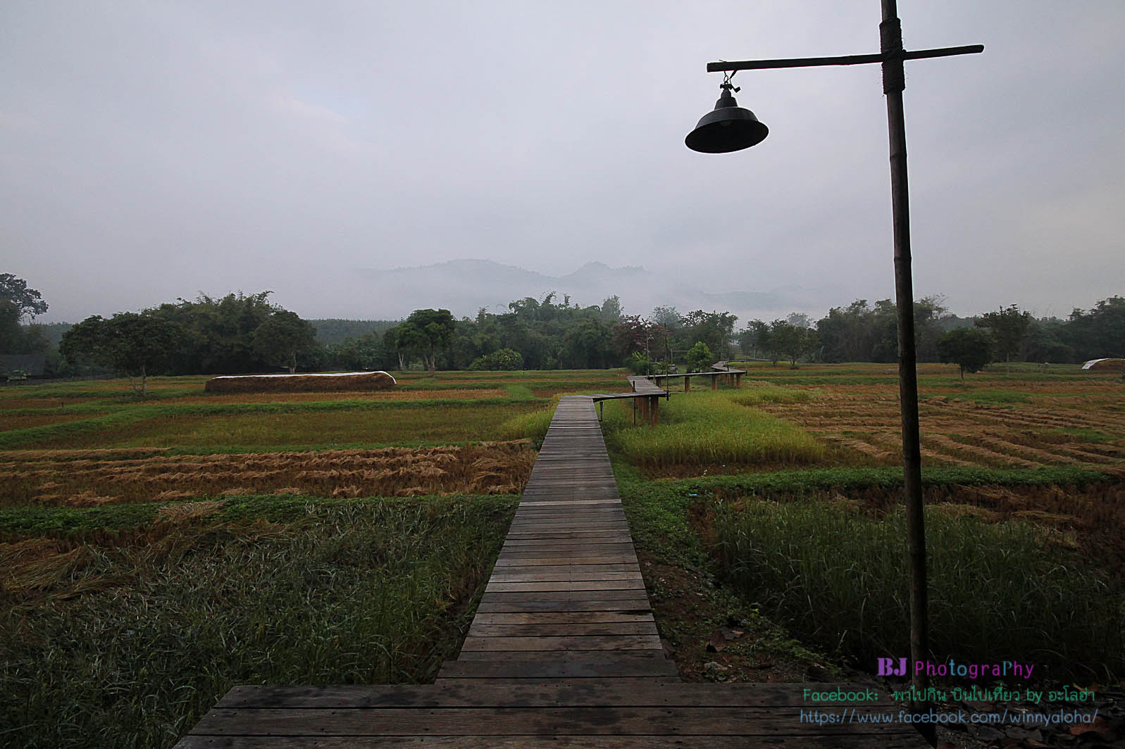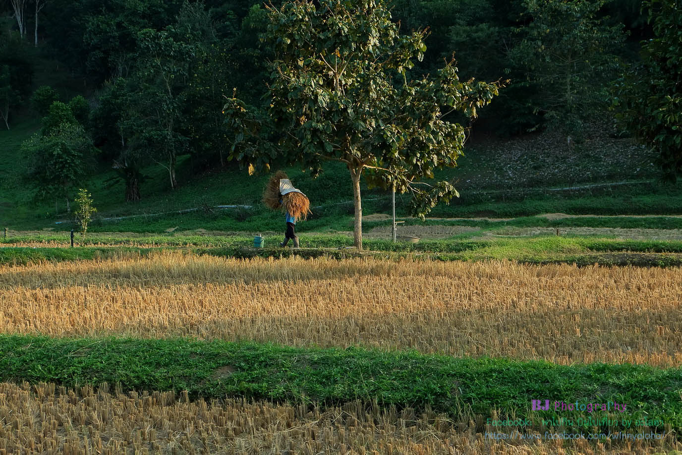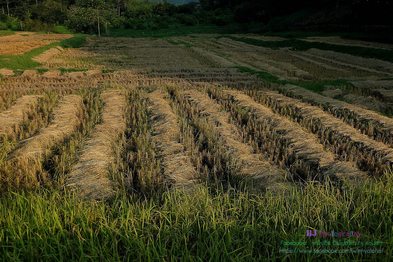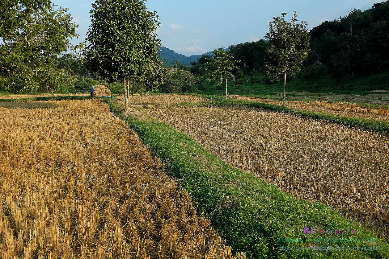 จึงไม่ได้เห็นทุ่งข้าวเขียวขจี แต่นาข้าวกำลังออกรวงสีทองและถูกเก็บไปเกือบหมดแล้ว ถ้าเป็นหน้าฝน คงจะเขียวชอุ่ม สดชื่น