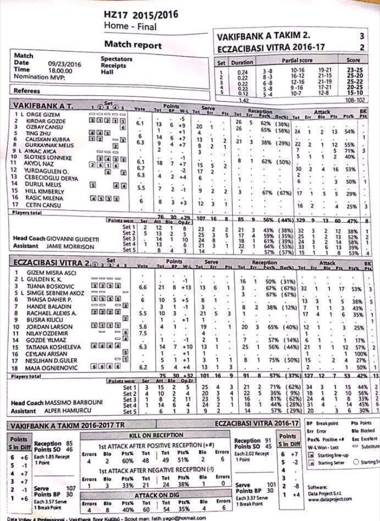 Galatasaray VS. Eczacıbaşı VitrA 2:3 (25-23 , 21-25 , 14-25 , 25-19 , 13-15) Statistics สถิติไปเจอในเฟซกลุ่ม Volley-Turkey มาค่ะ Galatasaray นัดนี้เจ้เนสลีฮานท็อปสกอร์ 14 คะแนน ปิดบอลแรก โคเช 1