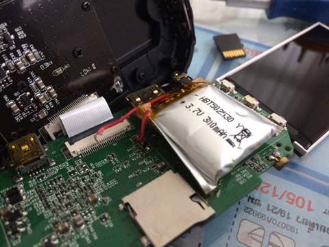 หลังจากนั้นก็เอาการ์ดที่เสียบผิดแล้วหลุดเข้าไปในกล้องเสียบเข้าที่เข้าทางสะ แล้วก็จัดการตัดสายแบตฯ ของกล้อง เอาแบตฯ ไปทิ้งสะเลย แล้วเดี๋ยวค่อยต่อสายตรงตามปกติเอา สบายใจขึ้นเยอะ
