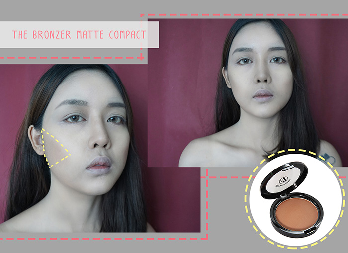 9. ขั้นตอนของการปัดแก้มนะคะ อีฟอยากได้แก้มสีออกน้ำตาลๆ แบบไม่มีชิมเมอร์ เลยเลือกใช้บรอนเซอร์แมทของ W7 ปัดบางๆ ที่ข้างแก้มตามที่ทำเส้นประสีเหลืองให้ดูในรูปเลยค่ะ