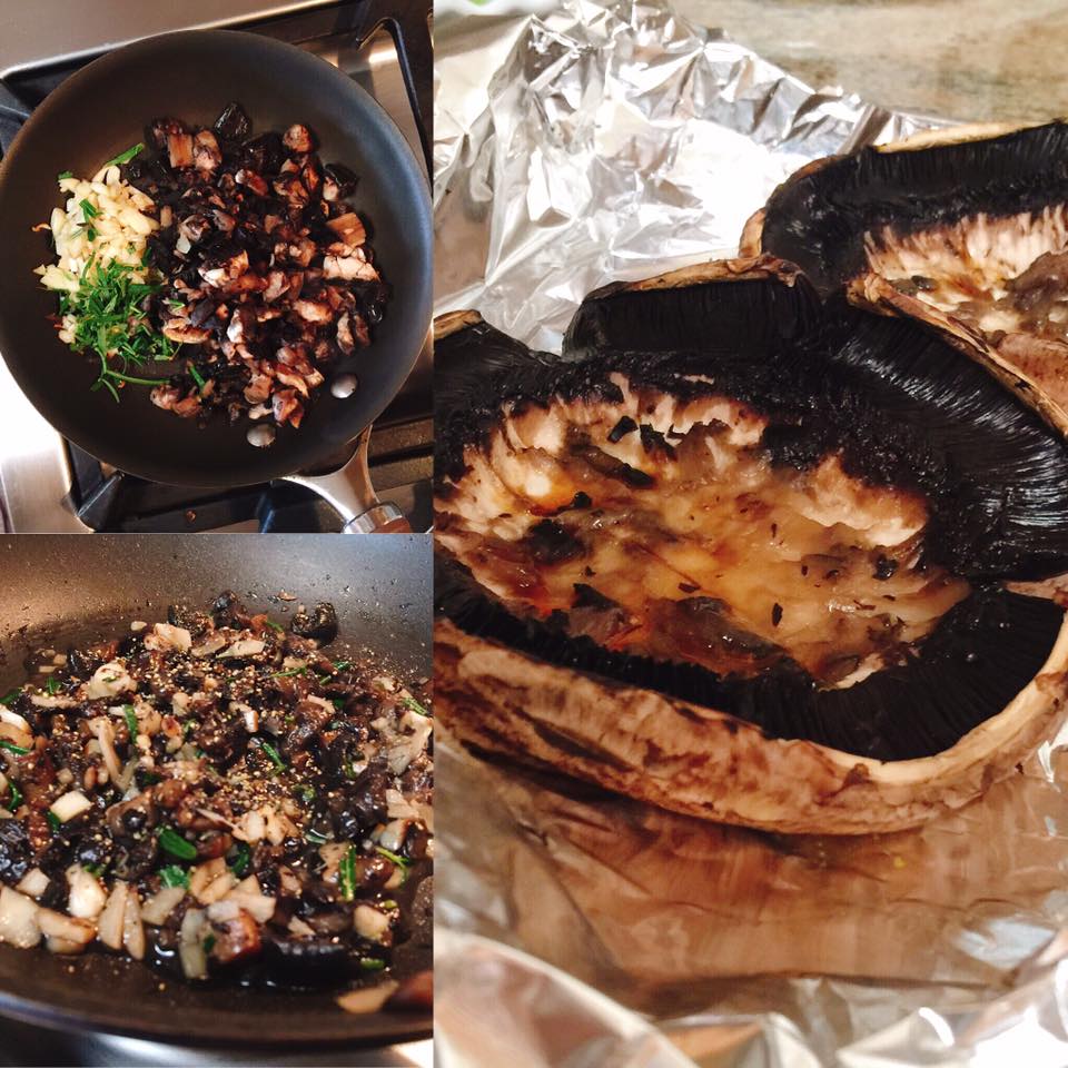 🍄หาเห็ด portobello ดอกใหญ่ๆ มาแงะเนื้อในออก แล้วก็หั่นเป็นเต๋า ชิ้นเล็กๆ เราจะเก็บเอาไว้ผัดกับกระเทียมพริกไทย