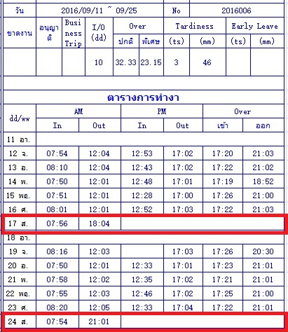ทีนี้หากเรากำหนดให้สแกน 6 ครั้ง คือ เข้าเช้า ออกเที่ยง เข้าบ่าย ออกเย็น เข้าโอที ออกโอที ดังเวลาต่อไปนี้ 8:00, 12:00, 13:00, 17:00, 17:30, 22:00 แต่พบว่าวันจันทร์ถึงศุกร์ไม่มีปัญหาเรื่องการแสดงข้อมูลทั้ง 2 sheet แต่จะเจอเฉพาะวันเสาร์เท่านั้นที่ใน sheet แสดงข้อมูลบัตรลงเวลาจะแสดงข้อมูลแค่ 2 ครั้งคือเข้าและออก เกิดอะไรขึ้น????