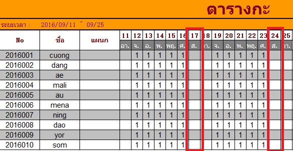 เพื่อให้มองเห็นภาพกันชัดขึ้นเราเอาภาพตัวอย่างมาให้ดูกัน ภาพด้านล่างคือ sheet บันทึก ซึ่งเป็นการสรุปจำนวนครั้งทั้งหมดที่พนักงานสแกนลายนิ้วมือ จะเห็นว่าวันเสาร์ที่ 17 มีการสแกน 4 ครั้ง และเสาร์ที่ 24 มีการสแกนทั้งหมด 6 ครั้ง