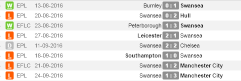 โดยที่ผ่านมา 8 นัดล่าสุด และเป็นการลงแข่งในพรีเมียร์ลีคใน EPLปีนี้ สวอนซีนั้นมีผลงานดังนี้