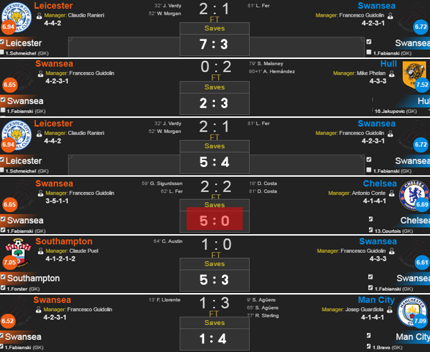 (รูปภาพข้อมูลประกอบ และได้ลงไฮไลท์สีแดงเอานั้นแหละ คือนัดเดียวที่ผู้รักษาประตูทีมคู่ต่อสู้ของสวอนซี ไม่ต้องทำงานหนัก)