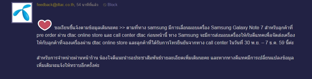 เมื่อวาน28/9/59 ลูกค้าที่จองnote7 ได้รับอีเมลล์จากDTAC เนื้อความหลัก คือ