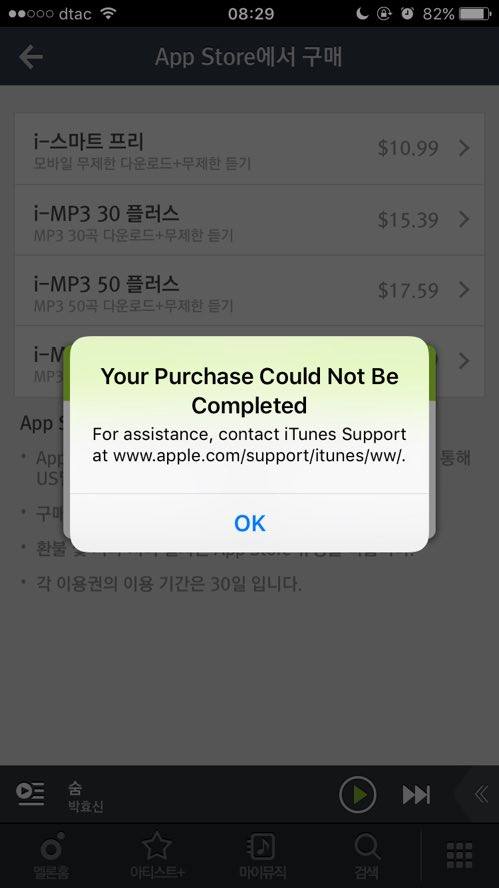 เราสมัครแอปเปิ้ลไอดีใหม่ เลือกสโตร์เป็นเกาหลี ใส่ที่อยู่ในเกาหลี ผูกกับบัตรเครดิตไทย ไอดีนี้สามารถซื้อแอพที่เสียเงินจากสโตร์เกาหลีได้(ตัดบัตรเรียบร้อยค่ะ) แต่พอจะซื้อแพ็คเกจในแอพ Melon Music(เป็นแอพขายเพลง/สตรีมเพลงแบบถูกกฎหมายของเกาหลี)กลับไม่สามารถจ่ายเงินได้ โดยขึ้นป๊อปอัพมาว่า