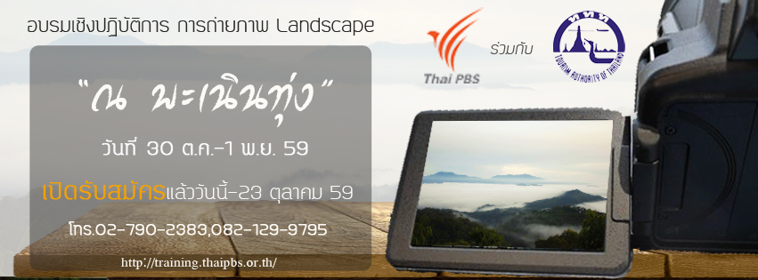 ไทยพีบีเอส ร่วมกับ การท่องเที่ยวแห่งประเทศไทย(ททท.) เปิดรับสมัครผู้เข้าร่วม อบรมเชิงปฏิบัติการ การถ่ายภาพ Landscape " ณ พะเนินทุ่ง" ในวันที่ 30 ตุลาคม ถึง 1 พฤศจิกายน 2559 แบบจัดเต็ม 3 วัน 2 คืน