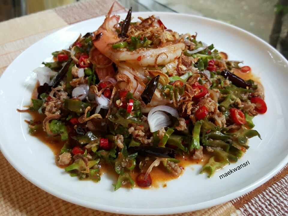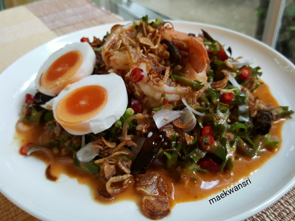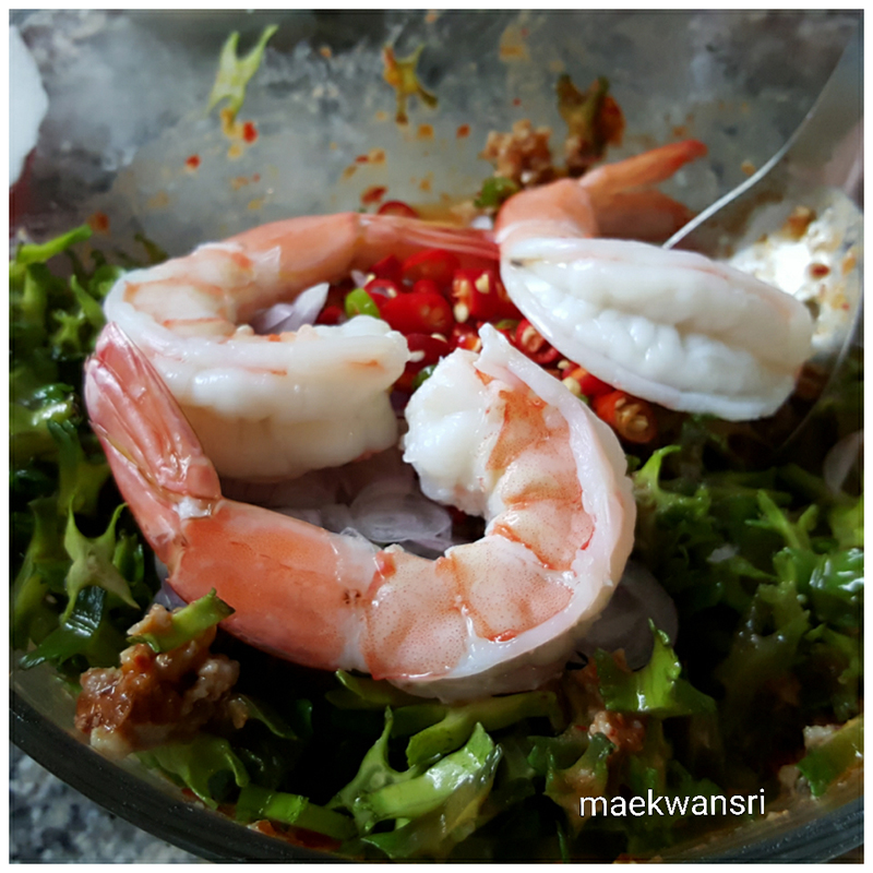 3.ใส่ถั่วพู/ กุ้งลวกหอมแดงซอย/พริกซอย ลงไป คลุกเคล้าให้เข้ากัน