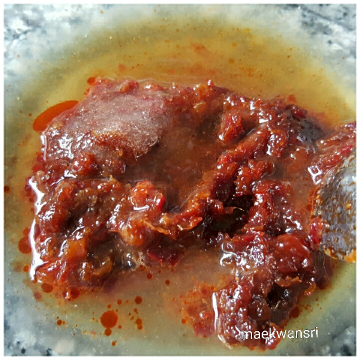 1.ผสมน้ำพริกเผา/น้ำมะนาว/น้ำตาล/น้ำปลา ให้เข้ากันพักไว้