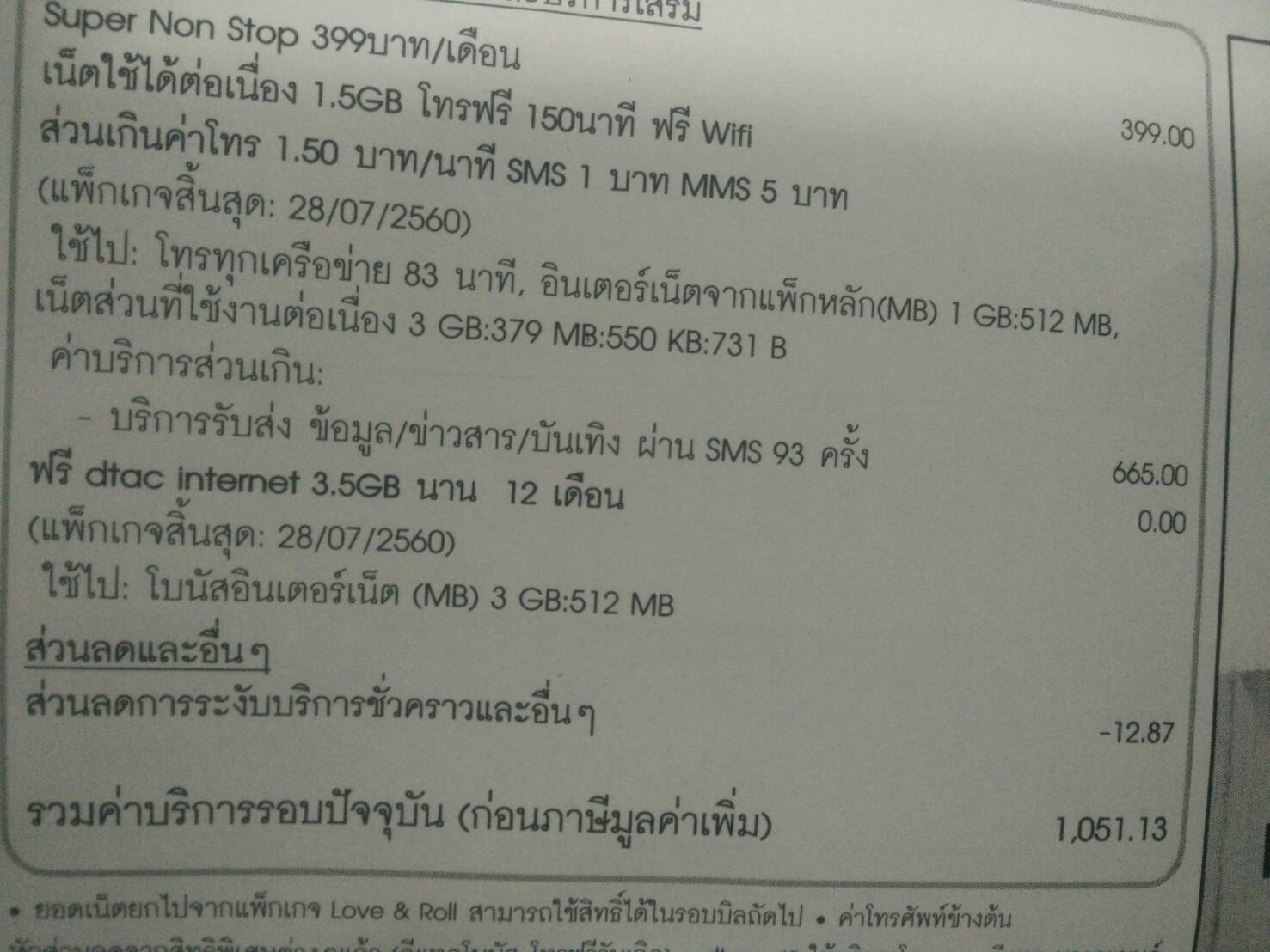 รายละเอียดของแพ้กเกจคือ เน็ต 1.5 Gb ต่อเดือน ค่าโทร 100 หรือ 200 นาทีนี่แหละ จำไม่ได้ "ตัดยอดทุกวันที่ 28 ของทุกเดือน" ซึ่งผมก็ขอให้จัดส่งเอกสารมาที่ที่พักผมเพื่อจะได้ทำรายการได้สะดวก (เตี่ยผมมีเงินค้างจากระบบเติมเงินเท่าไหร่จำไม่ได้ แต่เขาบอกว่าจะหักลบให้ตามจำนวนจริงด้วยนะ) และวันที่ผมพาเตี่ยไปทำสัญญารู้สึกว่าจะวันที่สิบกว่า ๆ นี่แหละ ก็จำไม่ได้อีก ซึ่งทางซูนย์ก็แจ้งว่าจะสามารถใช้งานได้ตามสัดส่วนของจำนวนวันที่เหลือ ซึ่งคำนวนแล้ว ผมก็ไม่ได้ติดใจอะไร (โรบินสันแพรกษา)