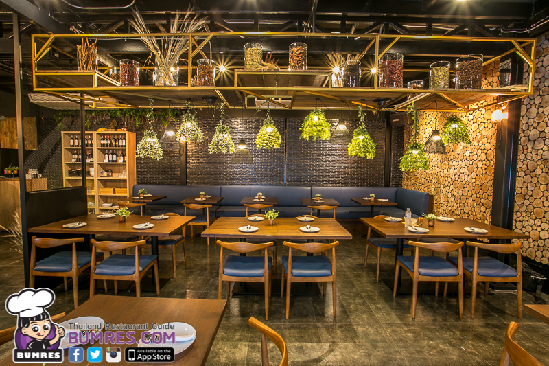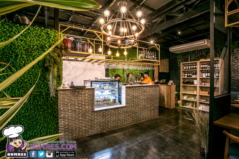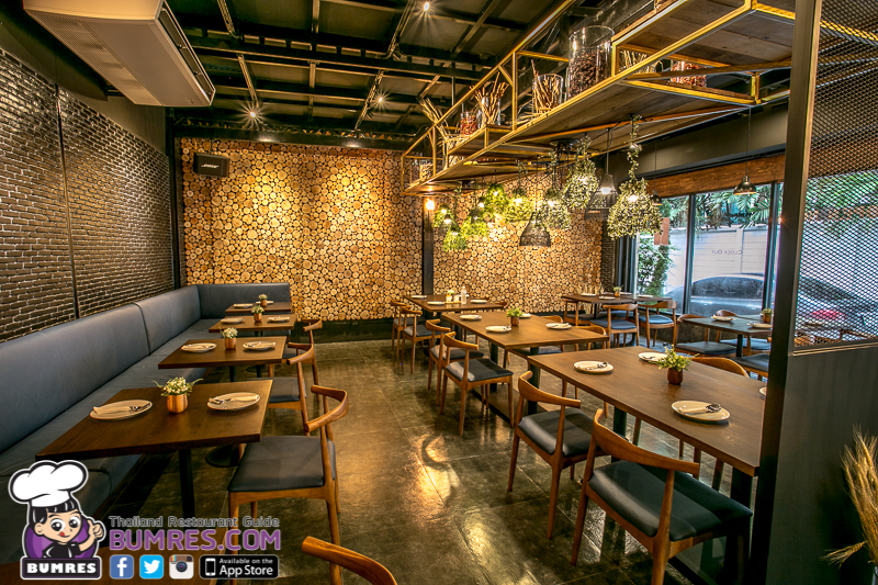 มีผนังที่เอาหน้าตัดของไม้มาเรียงโชว์กันทั้งแผง และก็มีการแซมด้วยสีเขียวของความเป็นธรรมชาติอยู่ตรงหิ้งด้านบนตรงกลางร้าน กับผนังด้านข้างอยู่ด้วย เรียกได้ว่าเรื่องบรรยากาศสำหรับการนั่งกินข้าว พูดคุย พักผ่อนหย่อนใจหลังเลิกงาน ได้คะแนนเต็มไปเลยครับ ร้านเปิด 2 ช่วง คือ 9.00-14.00 และ 17.00-23.00 น. ครับ