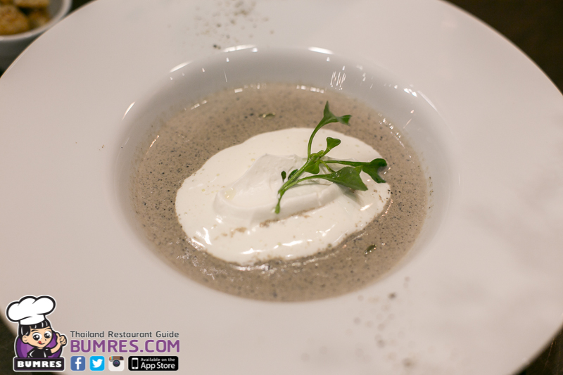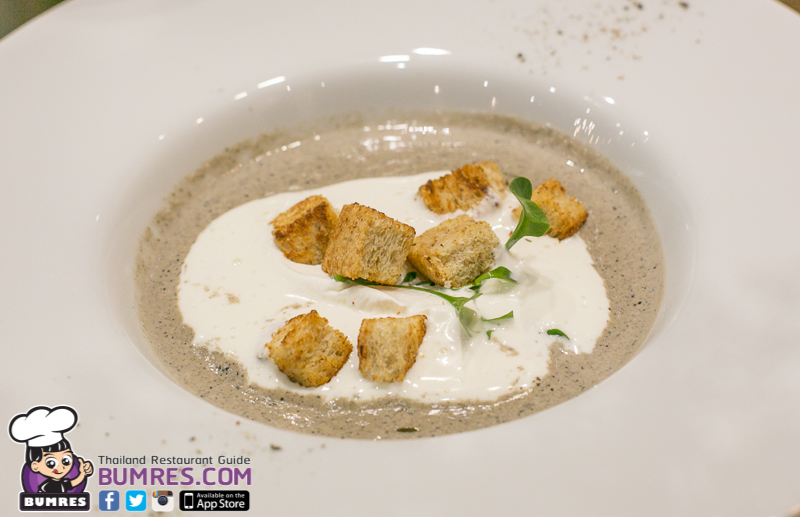 ตัวซุปมีความข้นกำลังดีจากการนำเนื้อเห็ดแชมปริยองมาปั่นกับครีม รสชาติและกลิ่นใช้ได้เลย ได้ความหวานอ่อน ๆ ของเห็ด และกลิ่นที่ได้จากการหยด Truffle oil ลงไปเล็กน้อย รสชาติไม่จัดมาก ออกแนวนุ่มละมุนมากกว่า เพราะว่าก่อนเสิร์ฟเค้าจะมีการตีฟองครีมด้วยไอน้ำ(คล้ายการทำคาปูชิโน่)ราดลงไปด้านบน ทำให้กลิ่นอบอวลอยู่ในปากได้อย่างดี