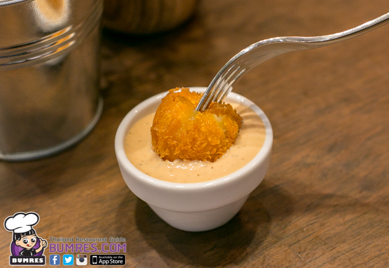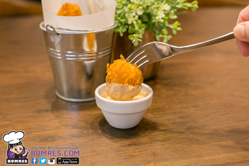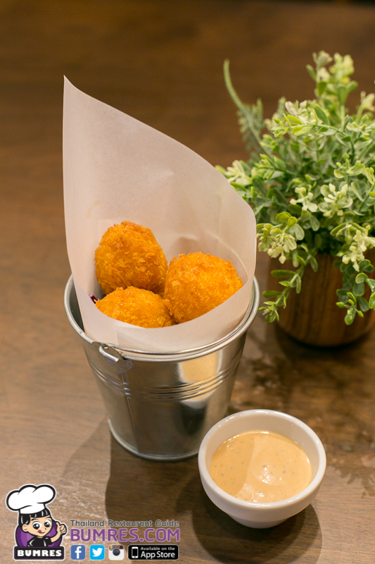 คาดว่าน่าจะเป็นมอสซาเรลล่าชีส ที่เนื้อนุ่มนิ่มแต่นำไปชุบเกล็ดขนมปังแล้วนำไปทอดจนเหลืองกรอบ ผิวด้านนอกนี่กรอบจริง ๆ แล้วแป้งไม่หนามาก ชีสด้านในก็อร่อย เค็ม ๆ มัน ๆ ดี จิ้มกับซอส Thousand Island ที่ทางร้านทำขึ้นเอง อร่อยดีครับ