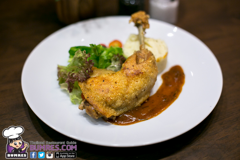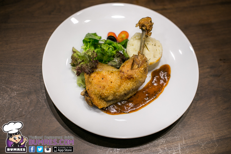 เมนูนี้ได้แรงบันดาลใจมาจาก duck confit ที่จะนำเนื้อเป็ดไปดุ๋นกับเครื่องเทศแล้วก็เอามาอบจนหนังกรอบ เนื้อล่อนออกจากกระดูก เมนูไก่อบหนังกรอบนี้ก็เช่นกัน เนื้อไก่นุ่มมาก หนังกรอบสุด ๆ กรอบบางแบบไม่มีที่ติ แต่รสชาติยังต้องเพิ่มความเข้มข้นอีกนิด เพราะว่าที่หนังกรอบเค็มกำลังดีแล้ว เพียงแต่เครื่องหมักมันดูจะยังไม่เข้าถึงเนื้อในของชิ้นไก่