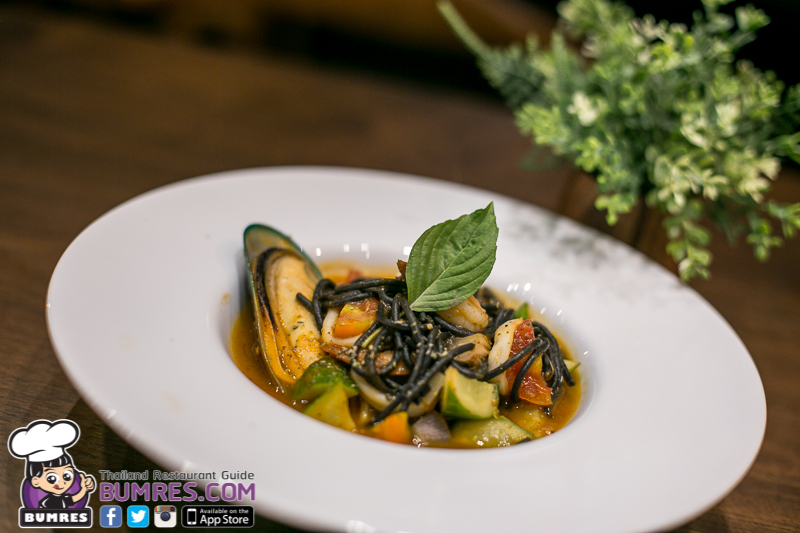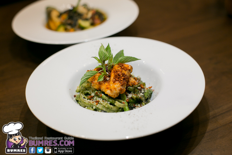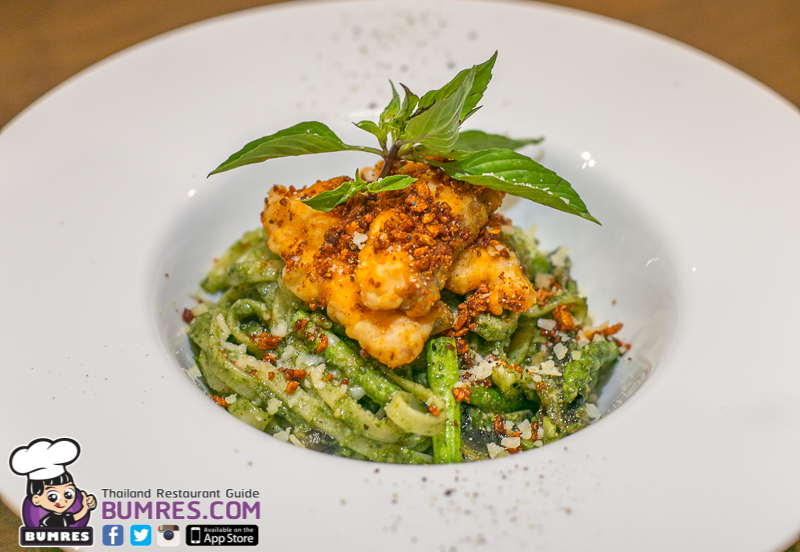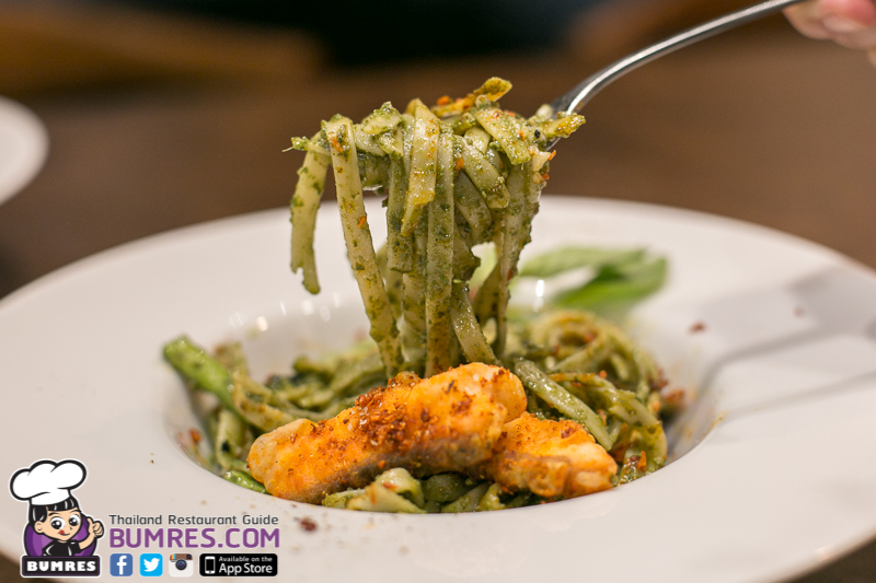 เป็นการผสมผสานระหว่างอาหารอิตาเลียนและอาหารไทย เพราะการทำเพสโต้แน่นอนว่าคือมาจากอิตาเลียน แต่แซลมอนสไปซี่ที่วางอยู่ด้านบนเนี่ยเข้มข้นตาตำรับไทยเลย จานนี้บอกเลยว่าอร่อยครับ กลิ่นหอม ได้กลิ่นหอมของ Basil ในเพสโต้ กลิ่นพริกและกระเทียมคั่ว