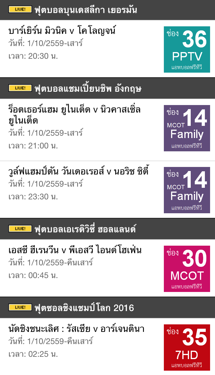 ผมทำเอง โหลดไป import ใส่ Calendar ของตัวเองได้เลยครับ ตั้งเวลาเริ่มไว้ตอนเริ่มถ่ายทอดสด คือ สมมติบอลแข่ง 3 ทุ่ม แต่ถ่ายทอดของรายการจะเริ่ม 2ทุ่มครึ่ง ผมจะตั้งไว้ที่ 2 ทุ่มครึ่งครับ อัพเดทช่องถ่ายทอด