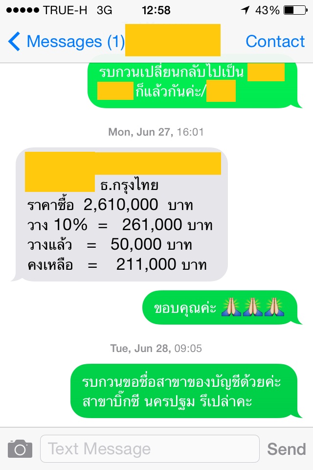 เจ้าหน้าที่ของธนาคารกรุงไทยสาขาบิ๊กซีนครปฐมได้โทรมาแจ้งให้ทำการโอนเงินประกันซื้อทรัพย์สินเพิ่มเติมด่วน ภายในวันที่ 28/06/2559 ดังข้อความจากมือถือด้านล่าง