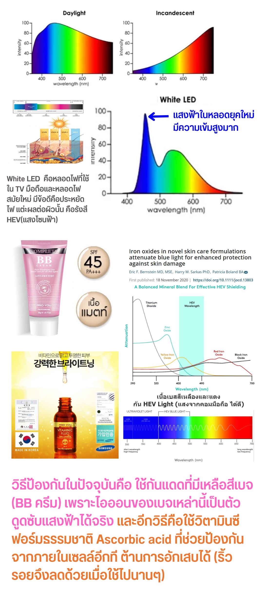 บีบี เนื้อแมท์คลาสสิค คุณภาพสูงจากเกาหลี SPF 45 PA+++ PROYOU * ข้อมูลใหม่คือ แสงจากคอม LED มือถือ ก็ทำให้ฝ้าเข้มขึ้นได้ แต่ไม่ใช่จ้า UV หากแต่เป็น HEV หรือ Blue Light ที่ครีมกันแดดปกติกันไม่ได้ แต่บีบี เนื้อสีขุ่นๆ และวิตามินซี 5% ขึ้นไปกลับต้านผลของมันได้ !