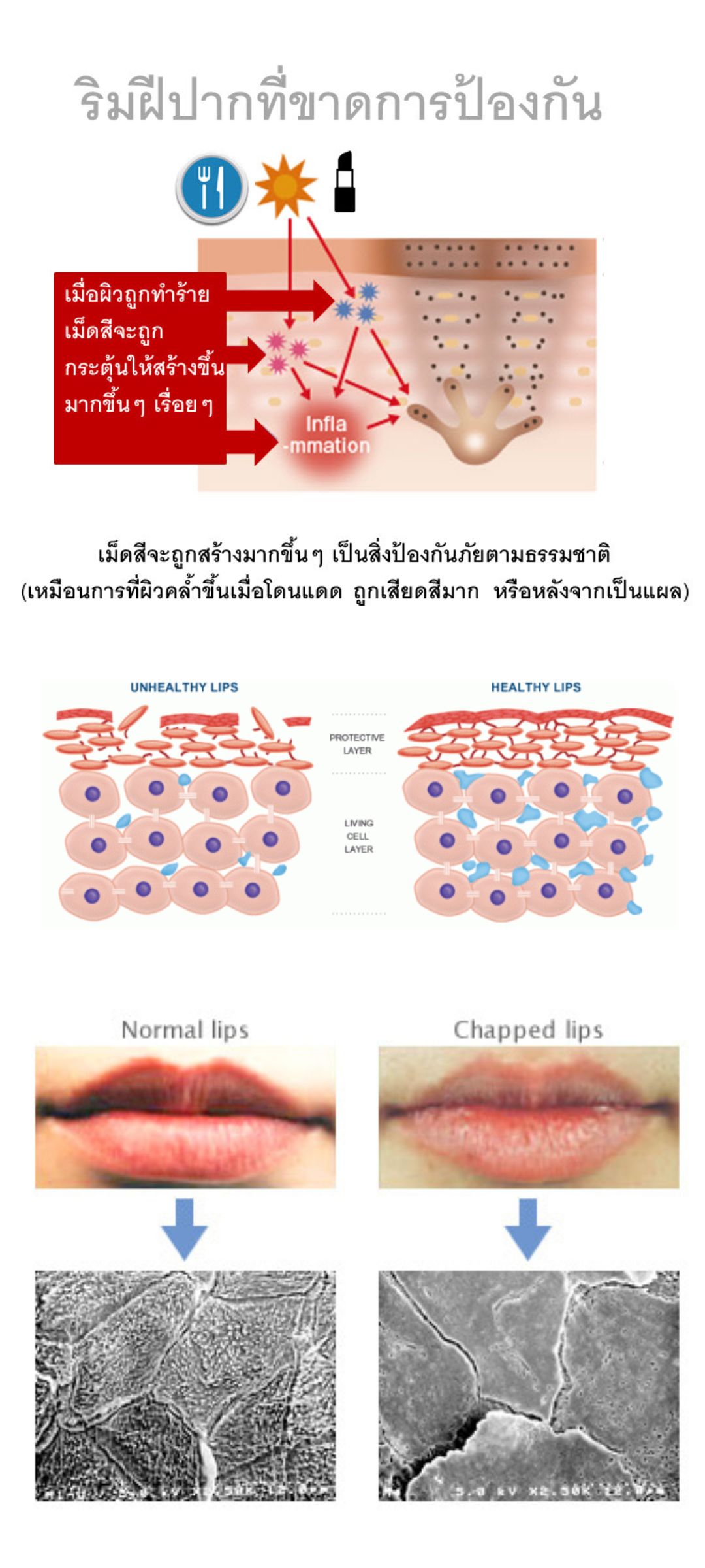 + ป้องกันการอักเสบระดับเซลล์ของริมฝีปาก อันเป็นสะสมของความเสื่อมชรา