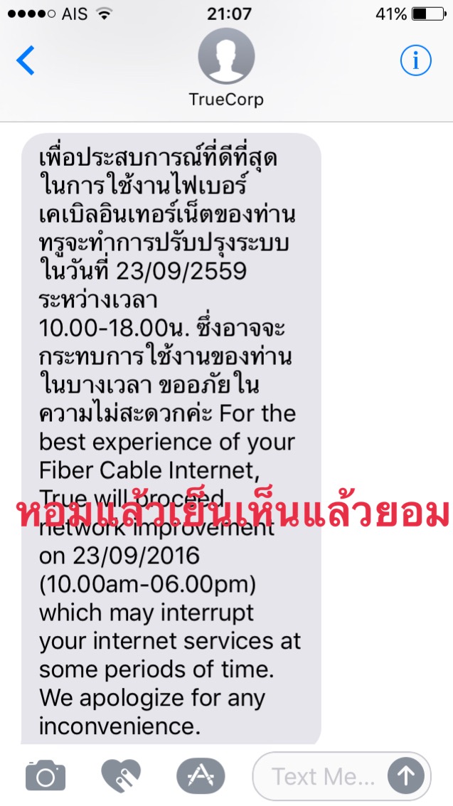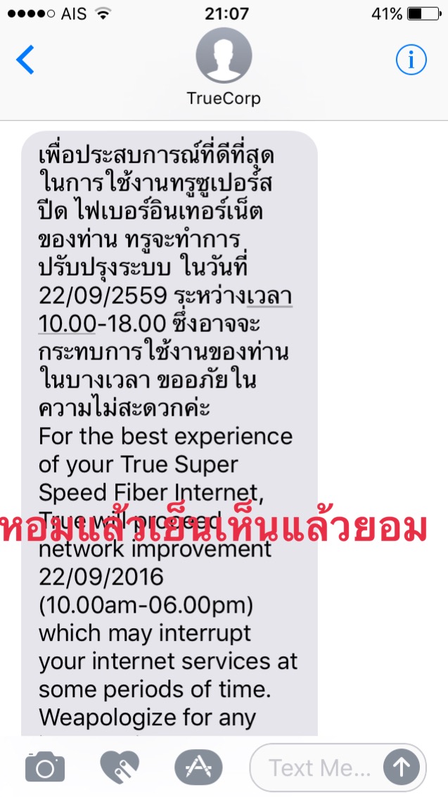 ช่วงวันที่23-24มีการส่งข้อความมาบอกจะปรับปรุงระบบไฟเบอร์อินเทอร์เน็ทก็หวังว่าจะดีขึ้นแต่นี่ไม่รู้ปรับปรุงยังไงช้ากว่าเดิมมาก ถ้านี่เรียกว่าการปรับปรุงผมว่าTrueคงเข้าใจอะไรผิดกระมัง