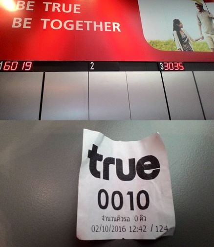 วันนี้ 2 ตุลาคม 2559 ช่วงเวลา 12.42 ผมกับแฟนไปชำระค่าบริการและจะสอบถามรายละเอียดการใช้บริการนิดหน่อยที่ True Shop สาขา เดอะมอลล์ นครราชสีมา ก็ กดคิวตามปกติ ได้คิวที่ 10 ก็รอสักพักนึง จนถึงคิวของตัวเองมีการเรียกคิวตามปกติ ก็ให้แฟนไปนั่งรอที่เก้าอี้ Counter หมายเลข 2 ตามไฟเรียกคิวที่ปรากฏ แต่พอหันไปอีกทีน้องคนที่ให้บริการหายไปแล้ว ไฟที่เรียกคิวก็ดับ แฟนนั่งรอนานมาก ผมก็เลยเดินไปด้านหน้า Shop มีน้องเจ้าหน้าที่ด้านหน้ามาสอบถามว่ามีอะไรให้ช่วยเหลือมั้ย ก็เลยบอกว่า มารอติดต่อ Counter รอนานแล้วไม่มีเจ้าหน้าที่มาให้บริการทั้งๆที่ มีการเรียกคิวแล้ว น้องคนนี้เลยเดินนำไปที่ Counter แล้วก็สอบถาม จนท Counter หมายเลข 1 ว่า น้องคนนั้นไปไหน คำตอบที่ได้ ไม่ทราบ ... แต่น้องคนที่ถามก็เข้ามานั่งให้บริการจนเสร็จสิ้นนะครับ แต่ที่ งง คือ ถ้าน้องคนนั้นจะไปกินข้าว เข้าห้องน้ำ แล้วเรียกคิวทำไม ถ้ามีการเรียกคิวอีก คิวนี้จะถูกกระโดดข้ามใช่มั้ย เพราะมีการกดเรียกคิวไปแล้ว