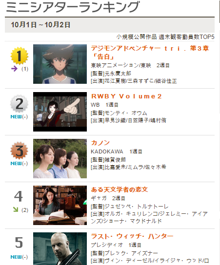 ส่วน mini theater chart สัปดาห์นี้แชมป์เป็นของ Digimon Adventure tri. 3: Kokuhaku ครับ