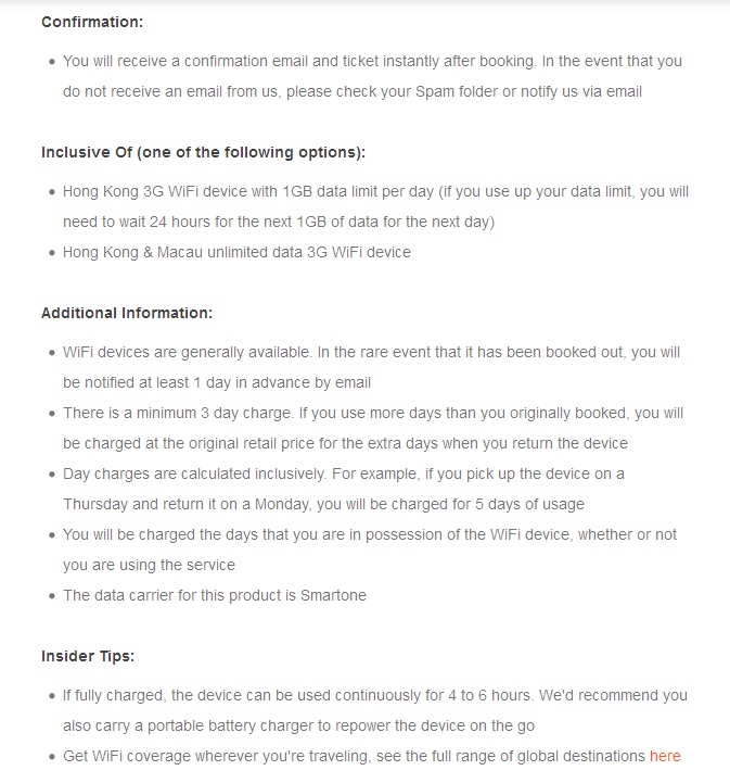 - จำนวน 3G Data ที่ได้คือ 1 GB ต่อ วัน (ชนิดใช้ที่ฮ่องกงอย่างเดียว) และ Unlimit (ชนิดใช้ฮ่องกง+มาเก๊า)