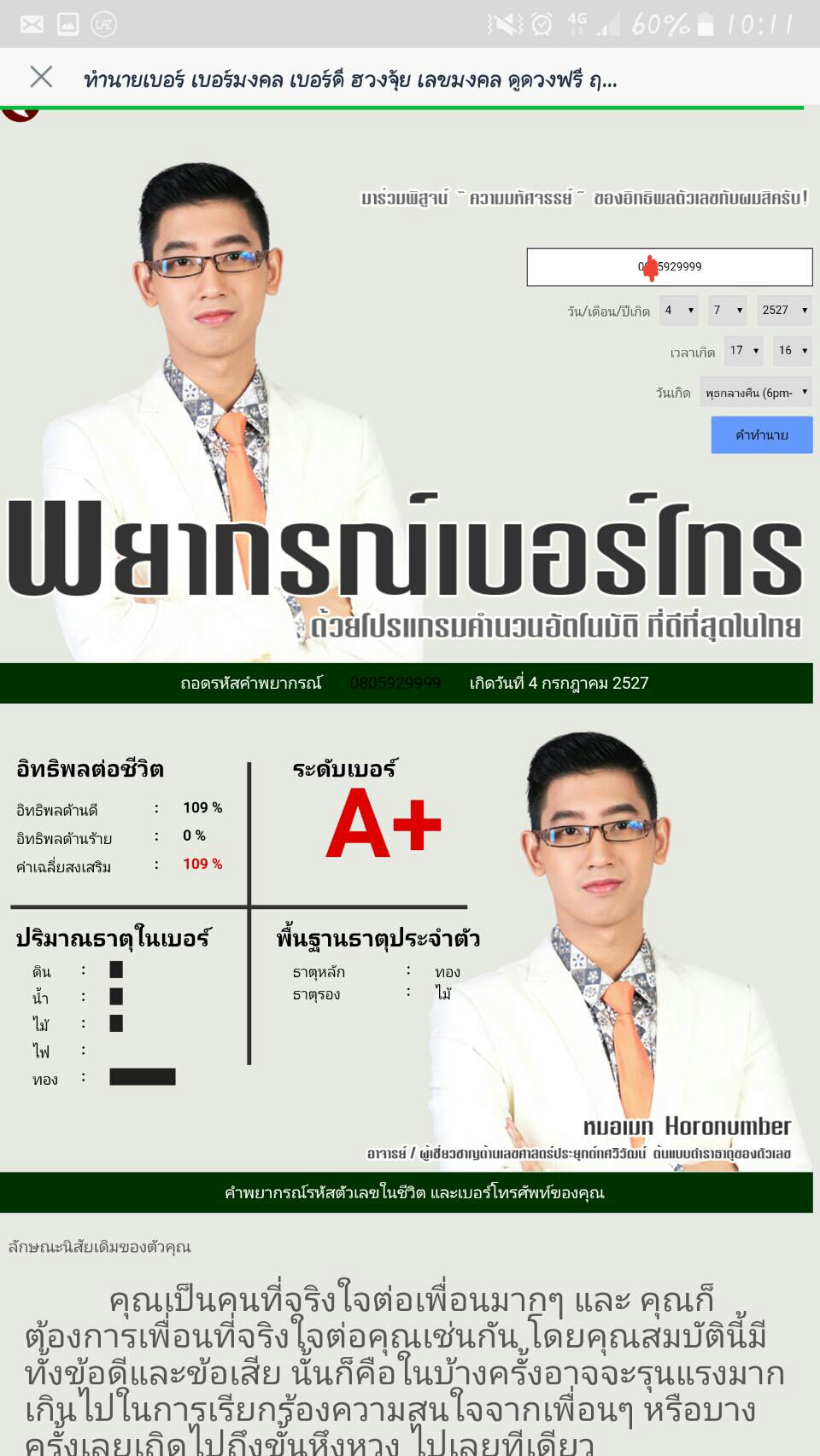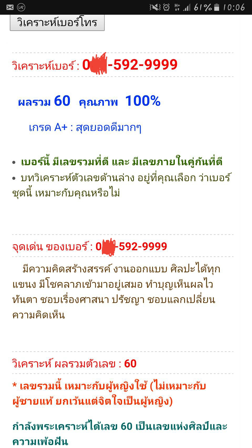 เบอร์ที่จองได้ 0xx5929999 เช็คตามเว็บวิเคราะห์เบอร์แล้ว ผลรวมดีครับ