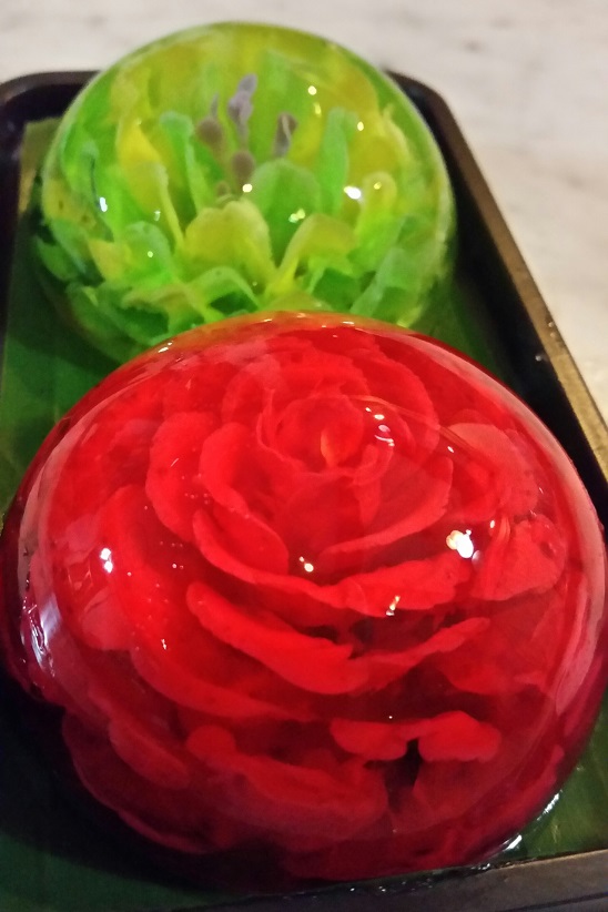 เป็นเจลลี่ที่ทำจากเจลาติน และดอกไม้ทำจากโยเกิรตผสมนมข้นค่ะ