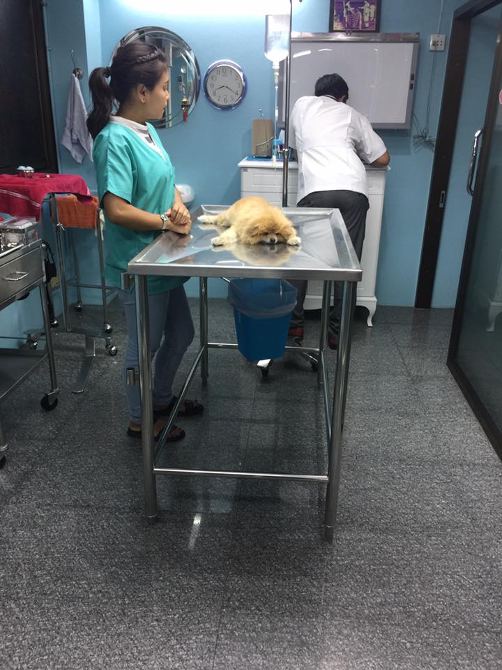พาไปหาหมอมาแล้ว หมอบอกว่าต้องตรวจเลือดถึงจะรู้ว่าเป็นอะไร แต่เบื้องต้นหมอบอกว่า หัวใจ กับ ไต ไม่ดีเหมือนระบบภายในจะล้มเหลว หมอให้น้ำเกลือ ฉีดยา ให้ยาปฎิชีวนะ แล้วก็ยาเคลือบกระเพราะมากินก่อน แล้วก็ให้ป้อนน้ำหวาน กับน้ำ บ่อยๆ