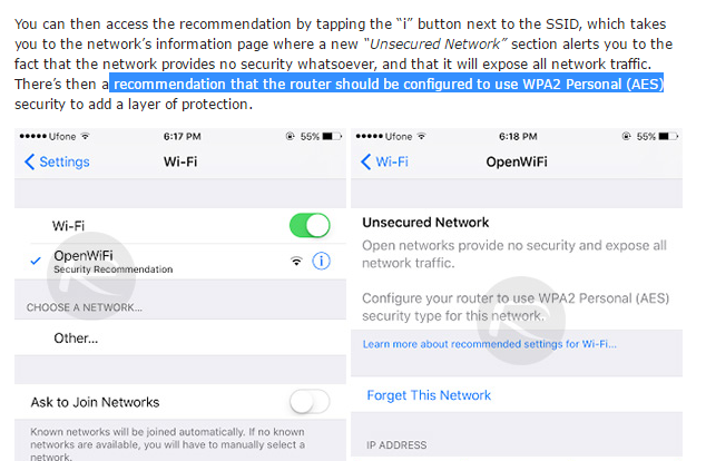 แต่รู้สึกว่า IOS จะเป็นผู้นำอีกแล้ว ที่กล้าที่ไม่ให้เชื่อมต่อกับ wifi แบบ Open
