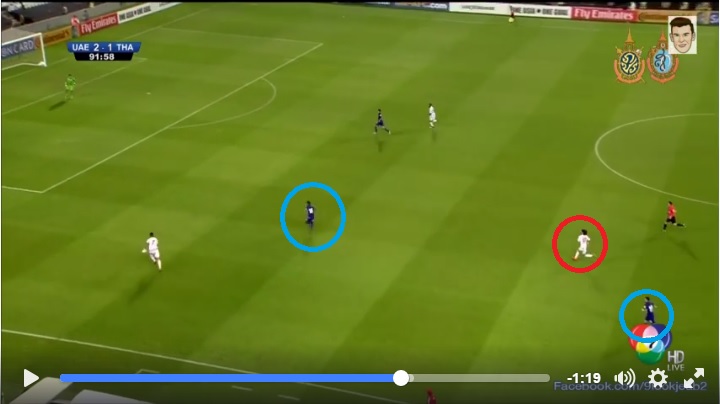 จังหวะแรก เขาวางบอลยาวมาให้ตัวที่อยู่ริมเส้นฝั่งซ้าย ข้ามหัว 2 นักเตะเราไป