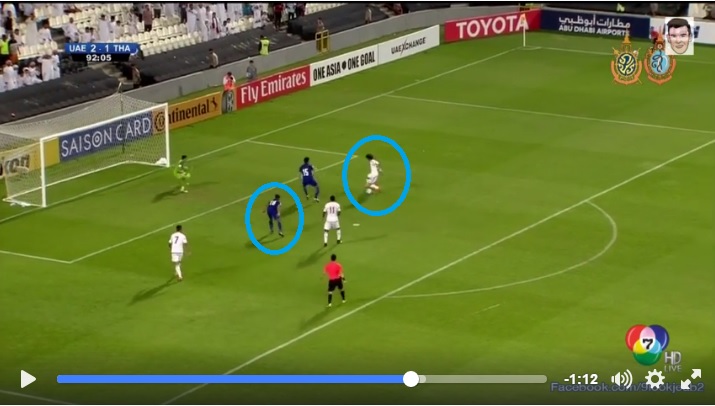จังหวะที่ 4 นักเตะคนนั้น หายไปแล้ว โอมาร์อยู่ในเขตโทษ หลอกผู้เล่นเราก่อนจ่ายถวายพานทองแท้ให้เพื่อนยิงตอกฝาโลงเรา