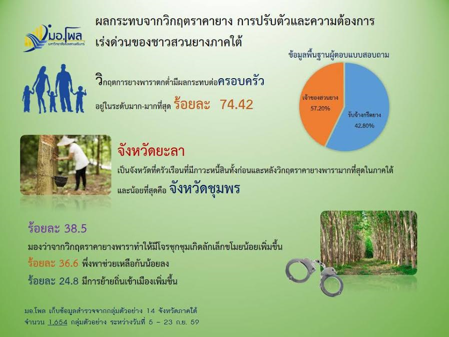 คณะทํางานการสํารวจความคิดเห็น ม.อ.โพล ศูนย์บริการวิชาการ มหาวิทยาลัยสงขลานครินทร์ เปิดเผยถึงผลการสํารวจความคิดเห็นของประชาชนชาวสวนยางภาคใต้จากผลกระทบวิกฤตราคายาง การปรับตัวและความต้องการเร่งด่วนของชาวสวนยางภาคใต้โดยสอบถามชาวสวนยางในพื้นที่ 14 จังหวัดภาคใต้ช่วงเดือนกันยายน 2559 เพื่อเป็นแนวทางให้หน่วยงานที่เกี่ยวข้องใช้เป็นข้อมูลเพื่อวางแผนการพัฒนา บริหารจัดการ และแก้ปัญหาให้กับประชาชนชาวสวนยางภาคใต้ ซึ่งพบว่าวิกฤตดังกล่าวมีผลกระทบต่อครอบครัวชาวสวนยางในระดับมาก ร้อยละ 40.8 ส่งผลให้รายได้ไม่เพียงพอ กระทบการศึกษาบุตร และมีหนี้สินเพิ่มขึ้น โดยจังหวัดยะลามีผลกระทบต่อครอบครัวมากที่สุด ส่วนจังหวัดตรังมีผลกระทบน้อยที่สุด และเกิดผลกระทบต่อชุมชนสังคมโดยมีโจรชุกชุม การลักเล็กขโมยน้อยเพิ่มขึ้น พึ่งพาช่วยเหลือกันน้อยลง และมีการย้ายถิ่นเข้าเมืองเพิ่มขึ้น