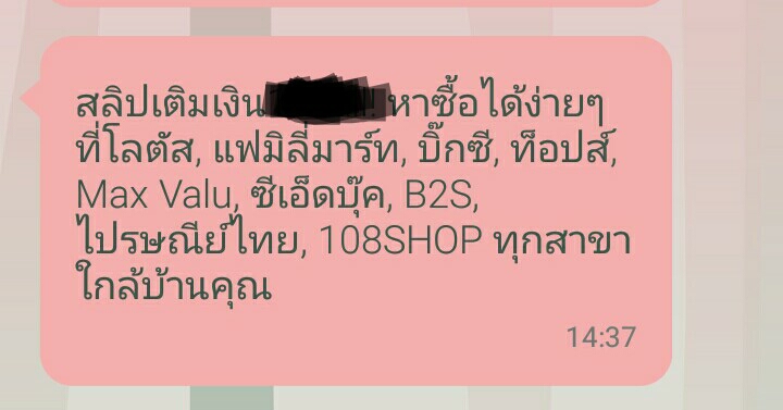 คือประมาณอาทิตย์ก่อนผมไปซื้อบัตรเติมเงินของเครือข่ายสีเขียวที่ร้านสะดวกซื้อชื่อดังพนักงานชุดเขียวอ่ะครับ พนักงานก็บอกว่าไม่มีทั้งสลิปและบัตรเเข็ง เมื่อวานไปถามอีกกะยังไม่มี จนวันนี้เครือข่ายสีเขียวส่งข้อความมาแบบนี้