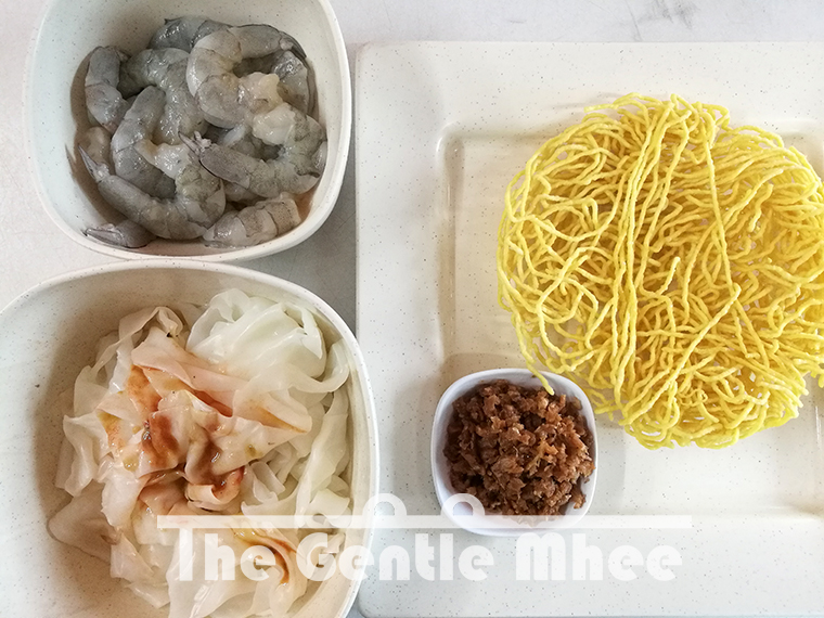 - เส้นใหญ่ 250 กรัม (เอาหัวกุ้งที่เก็บไว้ มาบีบ มารีด มาเค้นมันในหัวกุ้งออกมา คลุกกับเส้น)
